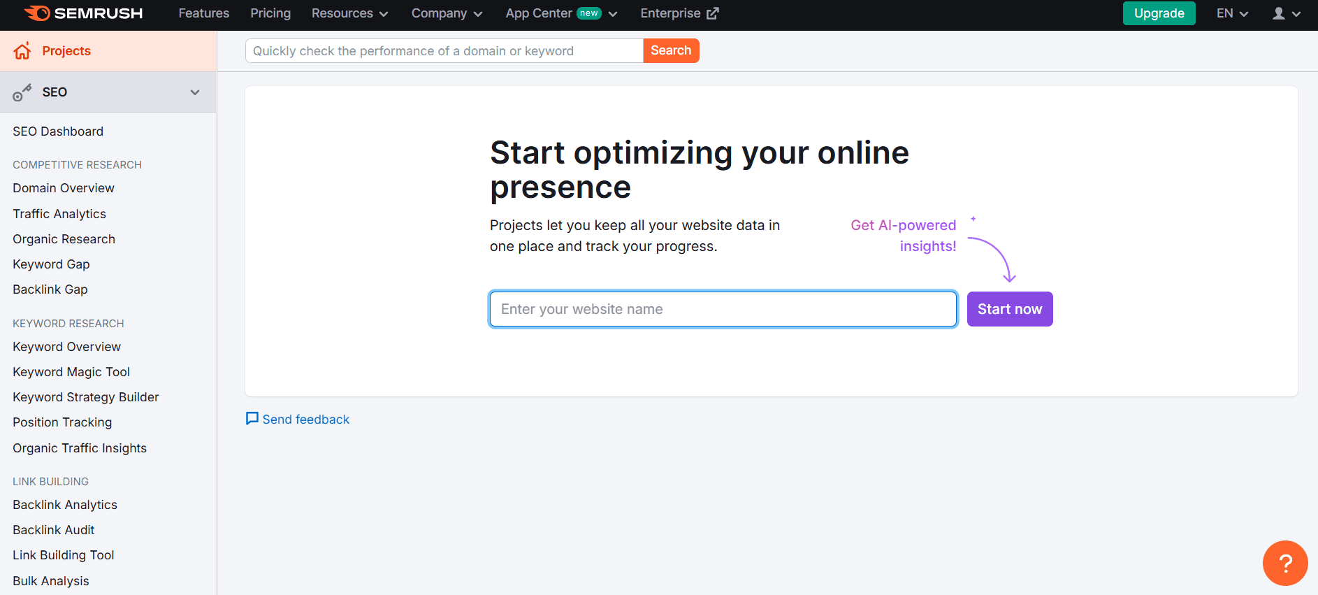 Semrush’s Dashboard Semrush is an all-in-one digital marketing tool offering a comprehensive SEO tool suite.