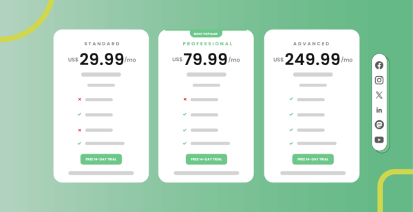 | Standard | US$29.99 | US$20.99 | 6 | $3 | 3 | Small businesses or freelancers needing unlimited scheduling but not advanced monitoring |