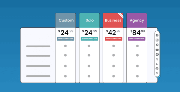| Monthly Price | $29.99 (billed annually) | $49.99 (billed annually) | $99.99 (billed annually) | $5 per social account | $8 per social account |