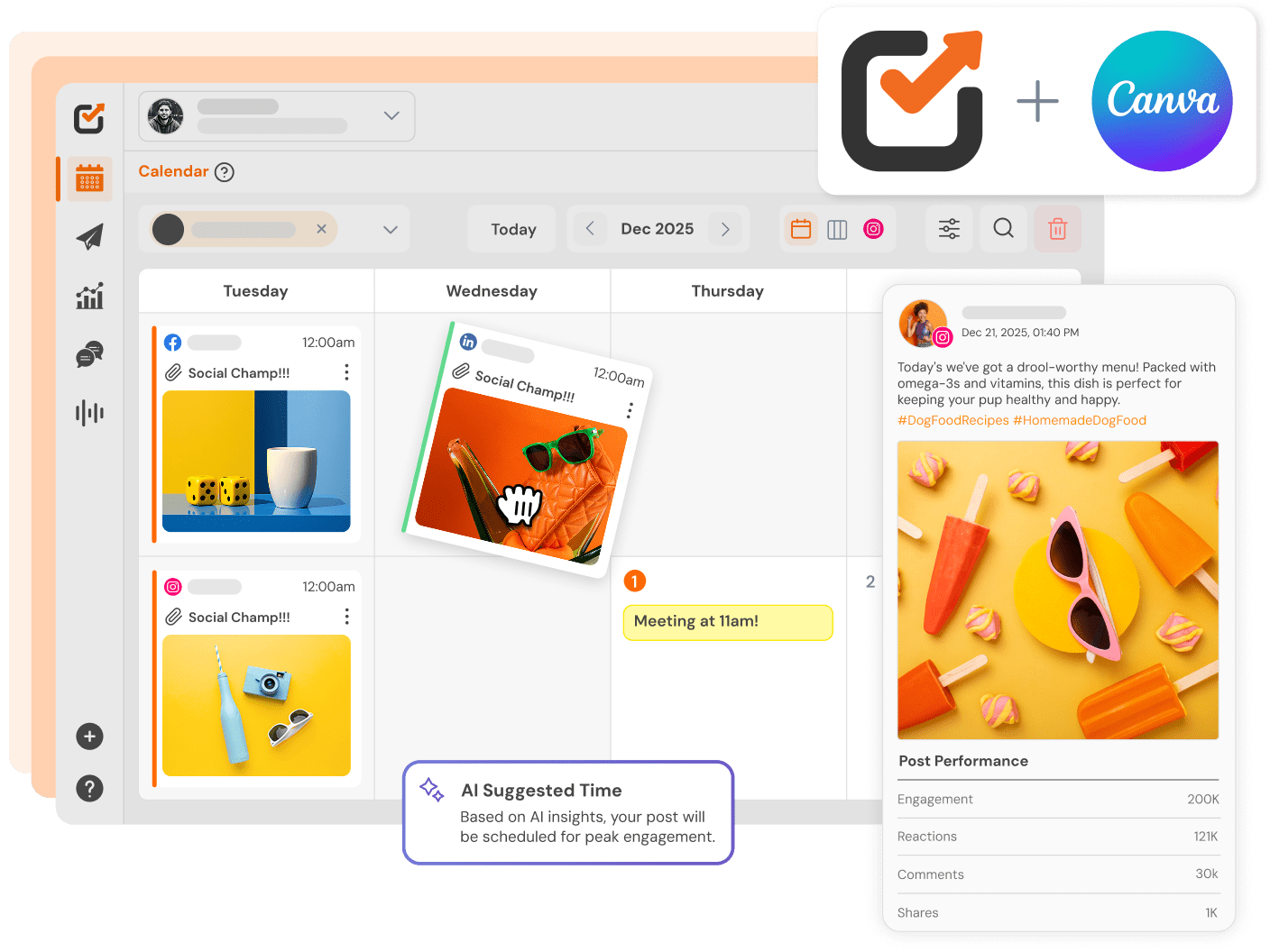 Import Canva visuals directly into Social Champ’s scheduler without manual file handling. Spend less time toggling between tools and more time delivering standout posts on every channel